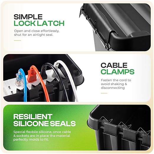 - PORTABLE & EASY TO USE – No Permanent Installation Required! The Innovative Interlocking Lid Opens Easily & Molds Tightly Around Power Cords When Closed