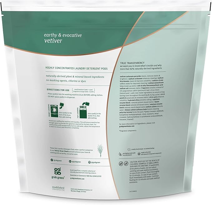 - Contains: 1- 132 Pod Bag of Grab Green Natural Vetiver 3in1 Laundry Detergent Pods. Our velcro closure bags are convenient and easy to use, no hassling with frustrating zip closures