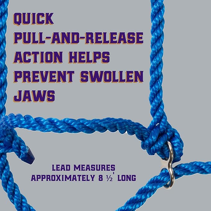 - Unique Rope Breaking Halter: Features quick pull-and-release action that helps prevent swollen jaws, unlike the slower release of conventional breaking cow halters; this fully-adjustable cattle show halter with lead is ideal for all cattle breeds