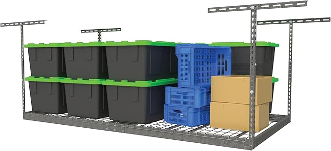 - MORE STORAGE, LESS CLUTTER: Designed with your storage needs in mind, ceiling mounted overhead garage storage helps you get organized by getting your things off the floor and out of the way saving valuable space in your garage. This hanging storage system is a great space saver; allowing you to utilize previously unused space providing you more storage and better organization.