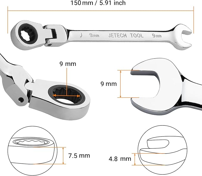 Jetech 9mm Ratchet Wrench Flex Head: Box End Wrench 12Pt| Metric Ratcheting Combination Chrome Vanadium,Forged, Extra Durability
