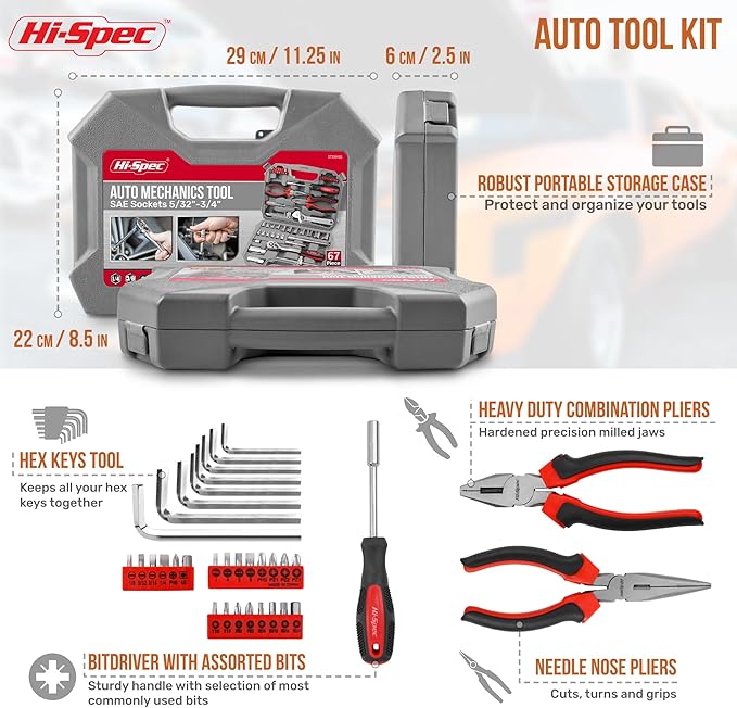 Hi-Spec Tools 67pc SAE Auto Mechanics Hand Tool Kit Set. Complete Car, Motorcycle, Engine & Garage Repairs with Sockets, Ratchet Wrench, Pliers & More