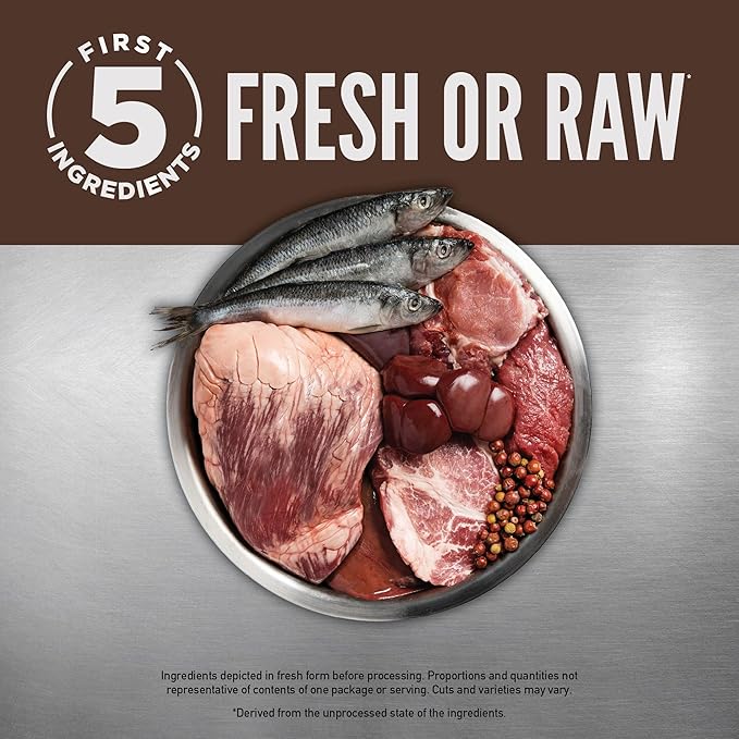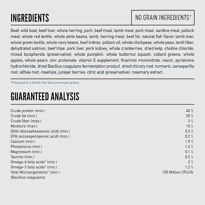 - First five ingredients are fresh or raw*** beef, pork, whole mackerel, beef liver and wild boar