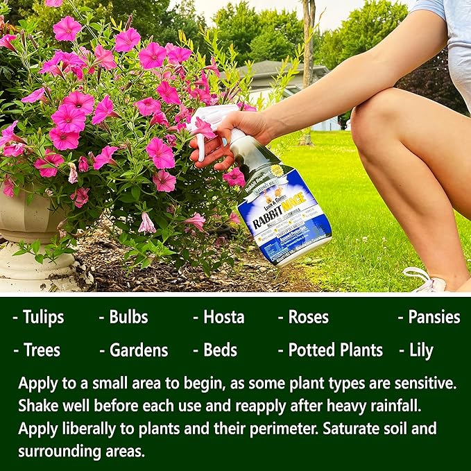 - EASY APPLICATION: Shake well before each use. Apply liberally to plants and their perimeter. Saturate soil, plants, and surrounding areas. Repeat the process once a week for 3 weeks. Apply approximately once per month thereafter for maintenance. This will train rabbits to avoid treated areas. Allow 20-30 minutes for the product to dry before watering. Re-apply after heavy rainfall.