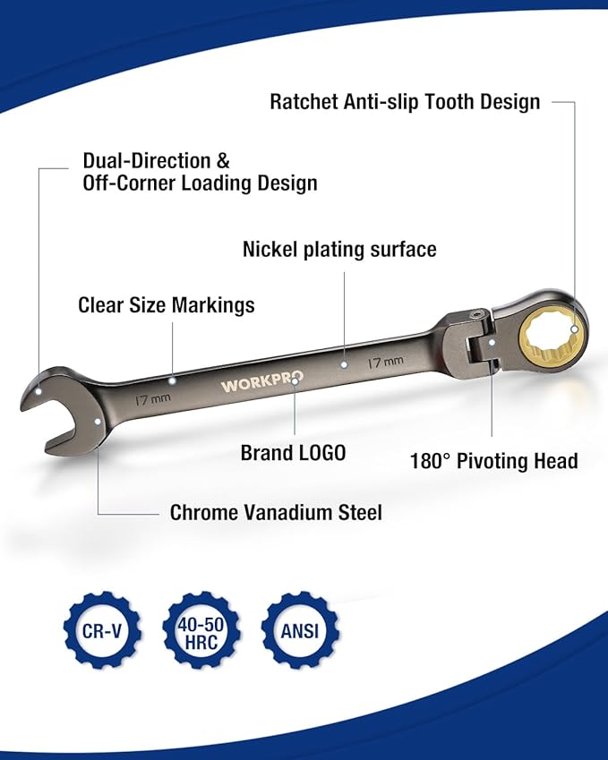 WORKPRO 8-piece Flex-Head Ratcheting Combination Wrench Set, Metric 9-17 mm, 72-Teeth, Cr-V Constructed, Nickel Plating with Organization Bag