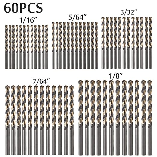 60 PCS, Black and Gold Twist Drill Bits, 1/16", 5/64", 3/32", 7/64", 1/8" [12pcs for Each]