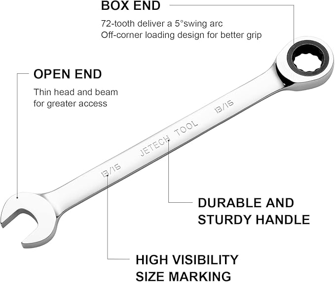 Jetech 13/16 inch Ratcheting Combination Wrench, Industrial Grade Gear Spanner with 12-Point Design, 72-Tooth Ratchet, Forged and Heat-Treated Cr-V Steel, SAE