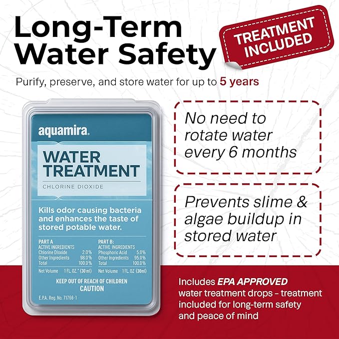 - INCLUDED WATER TREATMENT DROPS - Comes complete with water treatment drops that keep your water clean for up to 5 years. Simply add them to your filled containers—no need to periodically rotate your water.