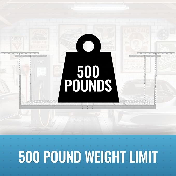 - INDUSTRIAL STRENGTH RACKS: Our industrial strength garage ceiling storage rack is designed to hold up to 500 lb per rackand is perfect for storing bikes, construction tools, storage bins, holiday decorations, and other items and accessories. The powder coat finish provides a durable, scratch, water, and rust-resistant surface; while case-hardened hardware and our patented ceiling brackets provide additional strength and safety for this hanging shelf.