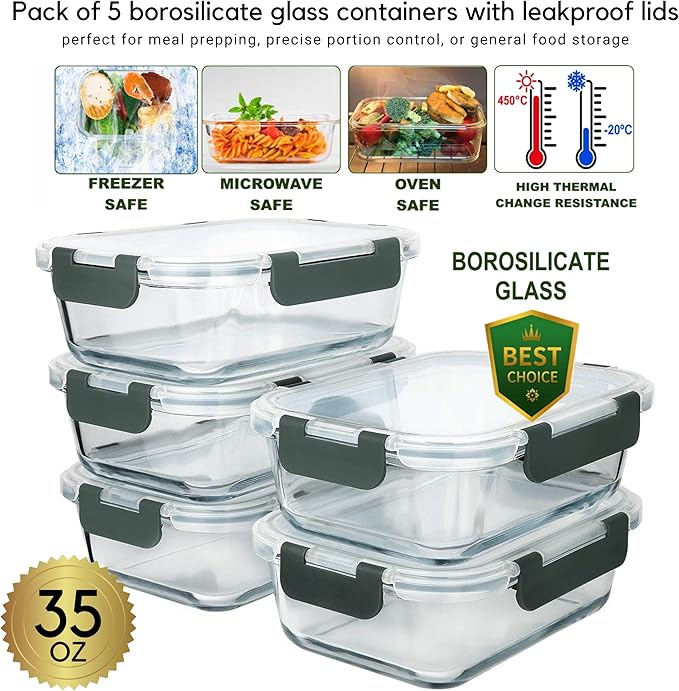 Brieftons Glass Meal Prep Containers: 5 Pack, 35 Oz with Airtight, Leakproof Snap Locking Lids, Perfect for Food Storage, Lunch & Portion Control, BPA-Free, Microwave, Oven, Freezer & Dishwasher Safe