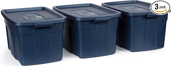 Rubbermaid Roughneck Tote 31 Gal, 3 Pack, Made in USA, Dark Indigo Metallic, Rugged Plastic Stackable Storage Bins with Lids and Handles