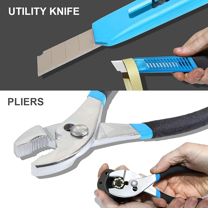 - HOUSEHOLD TOOL SET - Well thought out components that include hammer, knife, scissors, tape measure, pliers, hex keys and screwdrivers.