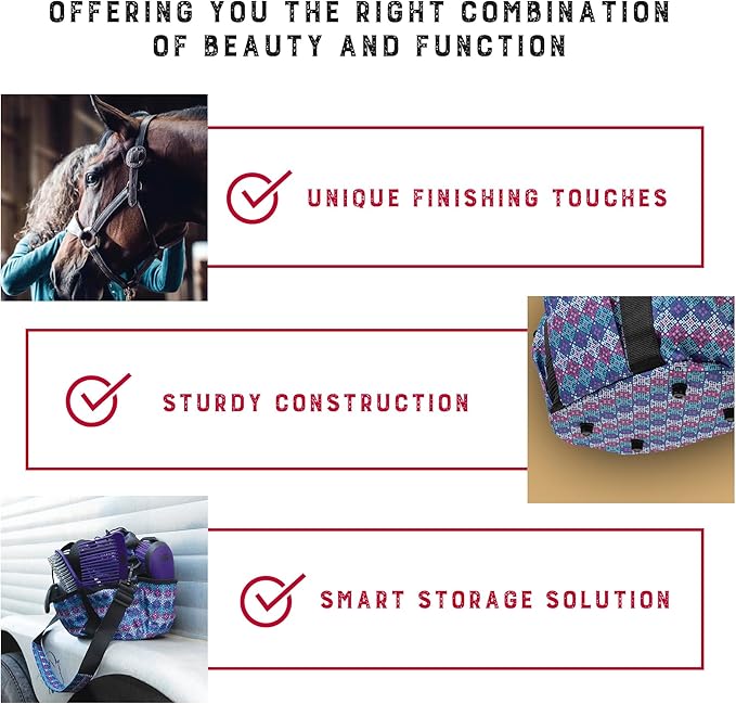 - Comfortable and Portable: Designed for easy use, the adjustable grooming bag for horses includes comfortable webbing handles and soft padded shoulder strap with on and off snap; effortlessly carry this lightweight equine grooming kit wherever you go
