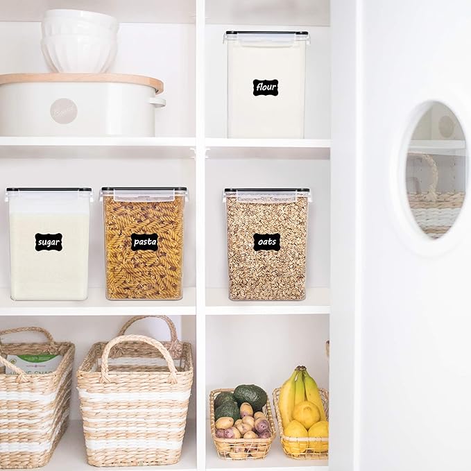 - Make a Huge Difference in Pantry Organization ---- If you already got tired of messy flour and sugar bags, then don't hesitate to choose our large food storage containers. These flour containers will make everything looks neat and in order. Come with 4 premium food storage canisters, 4 measuring cups, 24 chalkboard Labels, this container set will also be an ideal gift for any family.