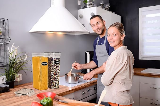 - MULTI PURPOSE: These containers are suitable for storing flour, sugar, rice, nuts, beans, cereal, snacks, pet food, or anything else you may need to store. The free labels help you mark the container content conveniently and make your kitchen look better than before.