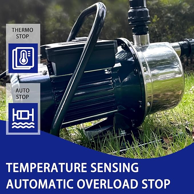 - 【Dual Safety Protection】The pressure booster pump features both automatic thermal overload protection to prevent motor damage and an auto-shutoff function to guard against dry-running. Note: For optimal performance, this garden pump requires manual priming with clean water before first use