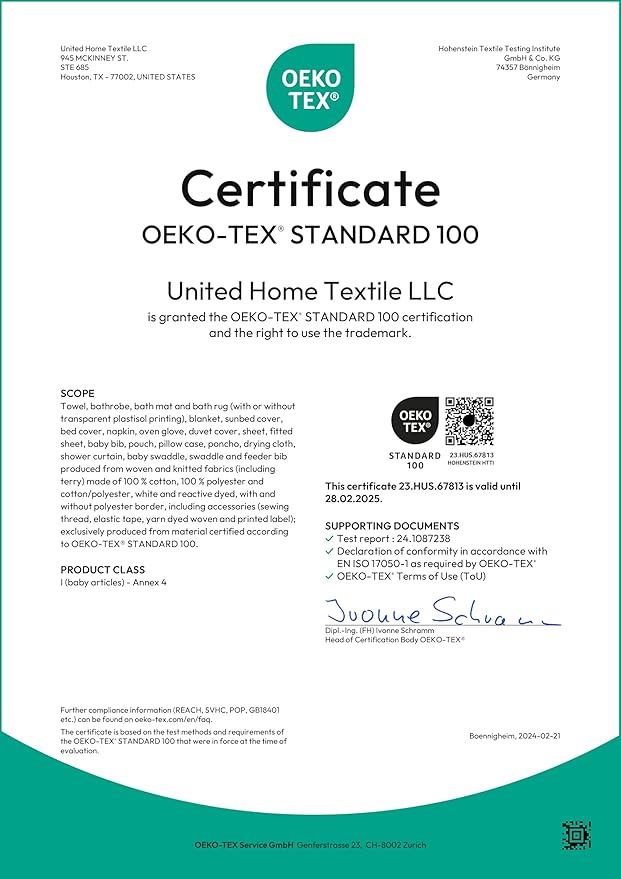 - ✔ OEKO-TEX STANDARD 100 keeps you and your family safe by testing [each component of] a certified product against a list of over 1,000 harmful substances. Certificate #23.HUS.67813 by Hohenstein.