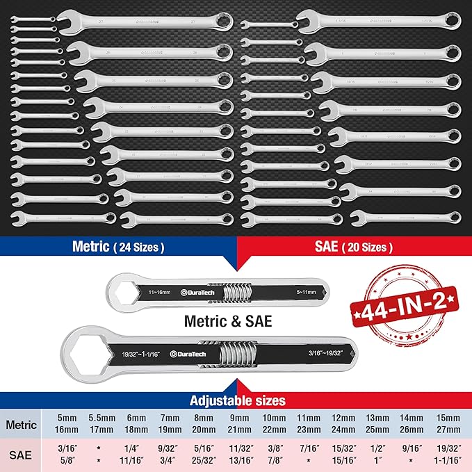 DURATECH Universal Wrench Set, Adjustable Wrench Set, SAE & Metric, 8-inch&10-inch, 44 sizes in 2 Piece, Drop Forged, ANSI standard