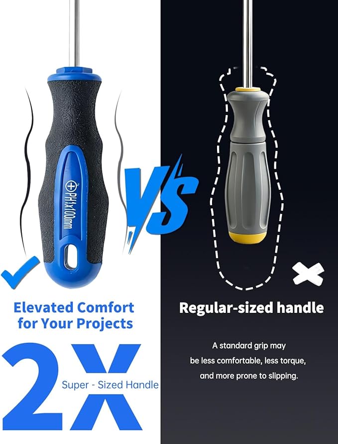 - ERGONOMIC HANDLE - non-slip and soft handle provides you a comfortable hold as well as maximum control at work. Handle slot accepts other screwdrivers for added leverage.