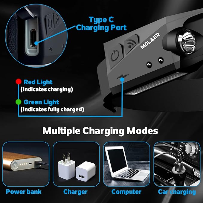 - 【USB-C Charging】 Built-in 1500mAh rechargeable lithium battery and Type-C USB input port, the headlamp can be charged via computers, car chargers and power banks, etc. It will flash red when the battery is low, the indicator light turns red to indicate that charging is in progress, When the green light is on, the battery is fully charged.
