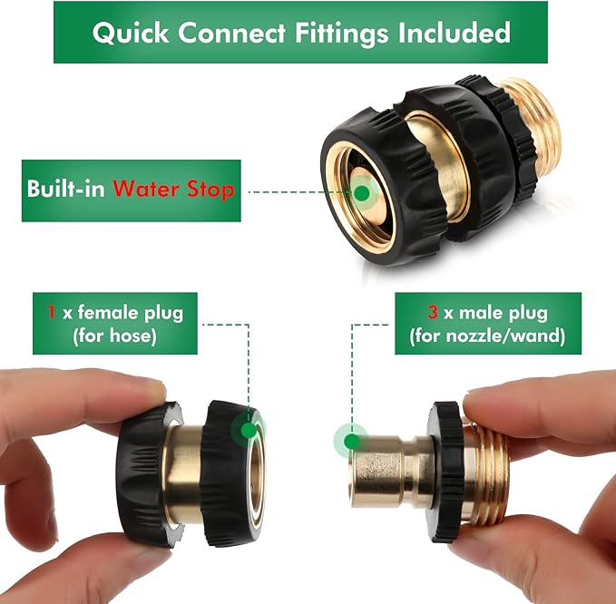 - 【Quick Connect Fittings Included】The quick connect fittings add much more comforts to your daily gardening jobs. Easy to connect and disconnect, rubberized grips design makes quick connector more convenient. With the built-in water stop function, you can switch tools quickly without turning the water off.