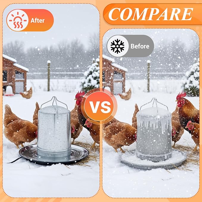 - Safe to Use: chicken coop heater has voltage of 110V, and no transformer conversion; The self limiting temperature of the drinker heater base is 140 Fahrenheit degree, safe to use, thermostatically controlled with 38 watts of operating power, energy saving and can be applied with plastic or metal water dispensers
