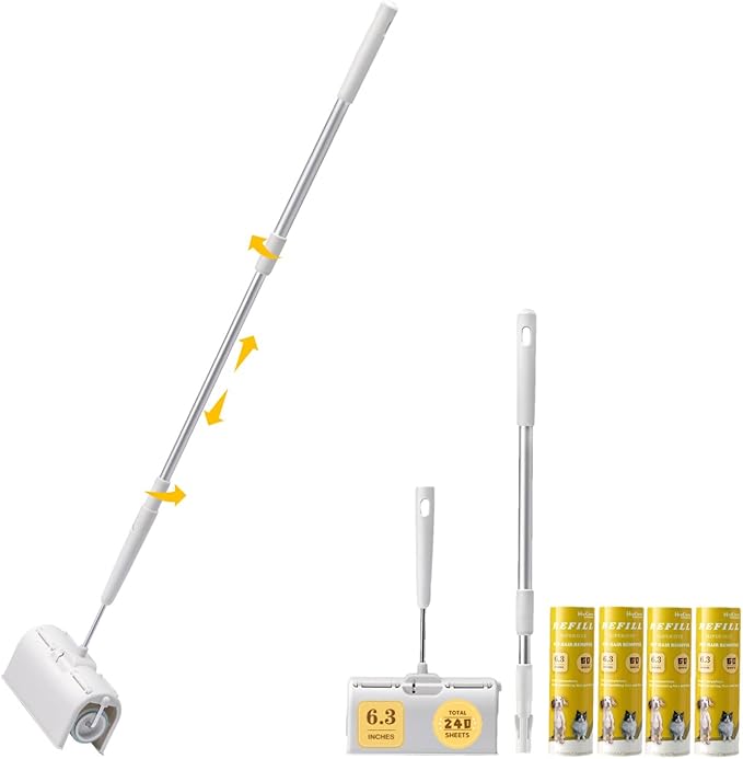 - 🏆 LARGE SURFACE, CLEAN MORE QUICKLY AND EFFICIENTLY: Large surface lint roller will serve as a perfect assistant in your home, office and car. Supersize 6.3'' lint roller with Easy Flip Cover consists of 4 Refills, total 240 sticky Sheets in a 2-in-1 design that can be used as long floor rollers for hard-to-reach areas, or handheld for small reach areas.. It is extremely easy and effective for all surfaces; clothes, furniture, sofa, carpet, bed, curtains, hardwood floor etc.