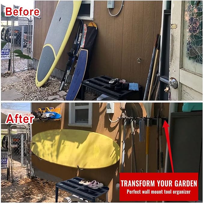 - DURABLE RAILS & RUBBER-COATED HOOKS: This garden tool organizer has 6 hooks, each 10 inches long. The hooks are wrapped in rubber to protect your tools from sliding and getting damaged. Rubber-coated sleeves prevent your tools from getting scratched or slipping.