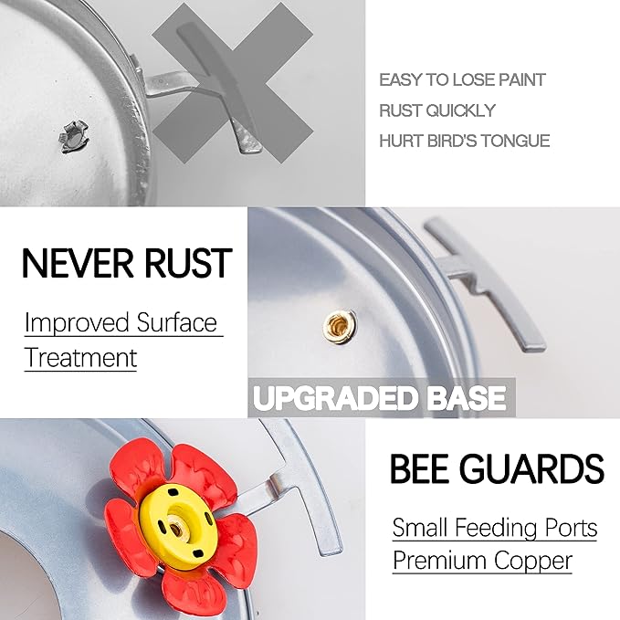 - 【Leakproof and SAFER Feeder Ports】The metal base is equipped with sealing ring and plastic basin for leakproof. UPGRADED feeder ports are made with premium copper materials, no sharp edges will cut or catch the hummingbirds' tongue. Make sure the gasket is securely attached before you hanging the hummingbird feeders outside.