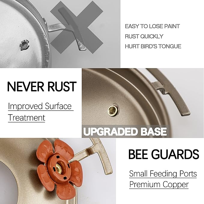 - 【Leakproof and SAFER Feeder Ports】The metal base is equipped with sealing ring and plastic basin for leakproof. UPGRADED feeder ports are made with premium copper materials, no sharp edges will cut or catch the hummingbirds' tongue. Make sure the gasket is securely attached before you hanging the hummingbird feeders outside.