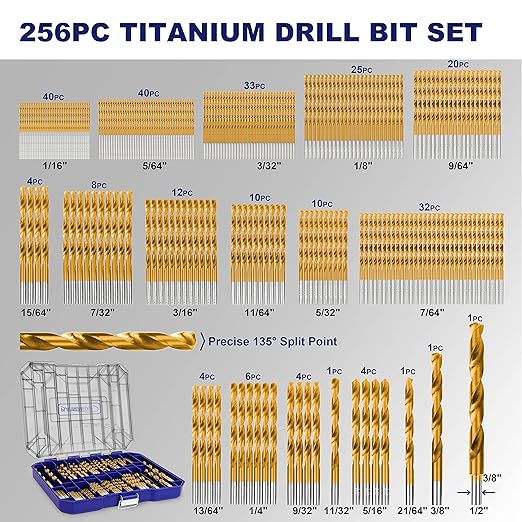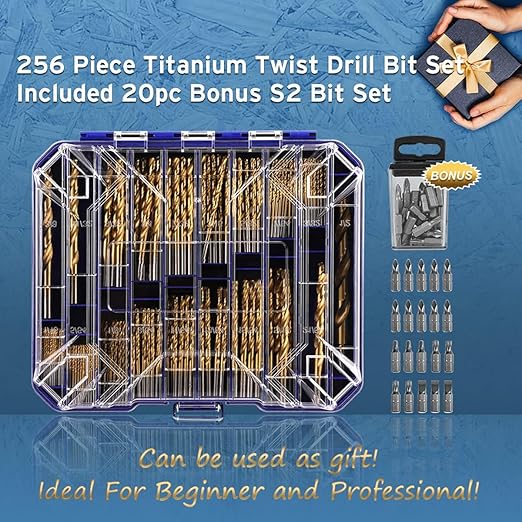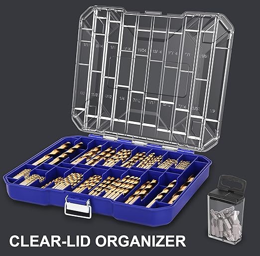 - Clear Lid Organizer: Clear lid Organizer of 256 Piece Titanium Twist Drill Bit Set offers easy visibility and organization