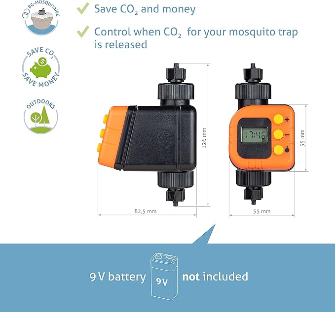 - Pack Includes: The BG-CO2 Timer is a precise CO2 controller featuring a display and buttons to set release times. It includes two connectors for CO2 tubes, requiring a 9V battery (not included) that lasts up to nine months. This CO2 controller ensures optimal performance and makes your outdoor mosquito trap efficient.
