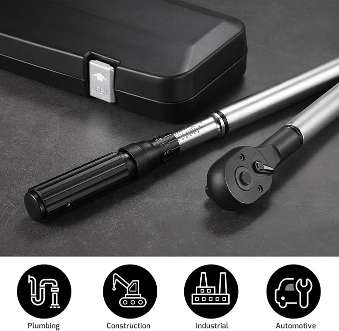 - 【CLEAR SCALE & EASY TO USE】: Torque wrench 3/4inch drive FT.LB and Nm dual scale range, both have independent corresponding sub-scales, more accurate reading and more convenient. The handle scale uses laser technology, clear and easy to read, not easy to wear. It is more convenient to use.