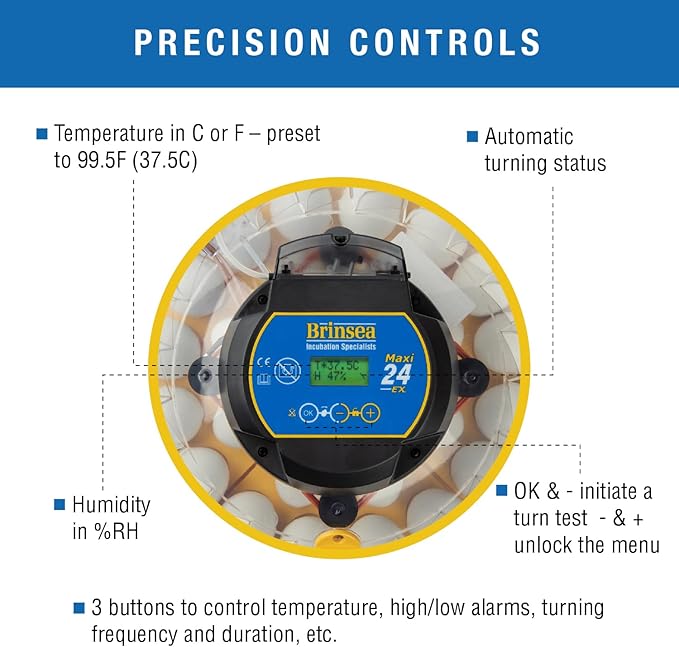- Advanced Controls: Fully digital interface displays critical data such as automatic egg turning status, incubator temperature in °F or °C and humidity (% RH), along with high/low alarms for optimal incubation conditions and peace of mind
