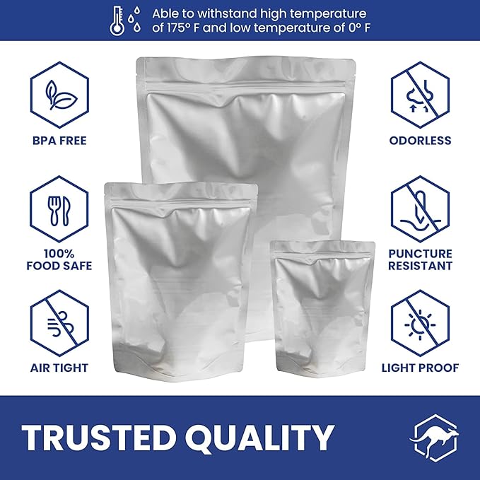 Wallaby 100ct Multi-Size Mylar Bags, 400cc Oxygen Absorbers, 15 & 10 Mil Total Thickness, 1-Gal, 1-Qt, 1/2-Pt, Stand-Up, Zipper & Heat-Sealable, Gusseted Zipper Bags for Long-Term Food Storage