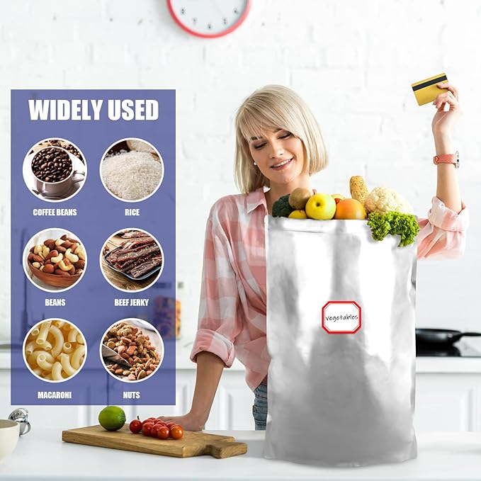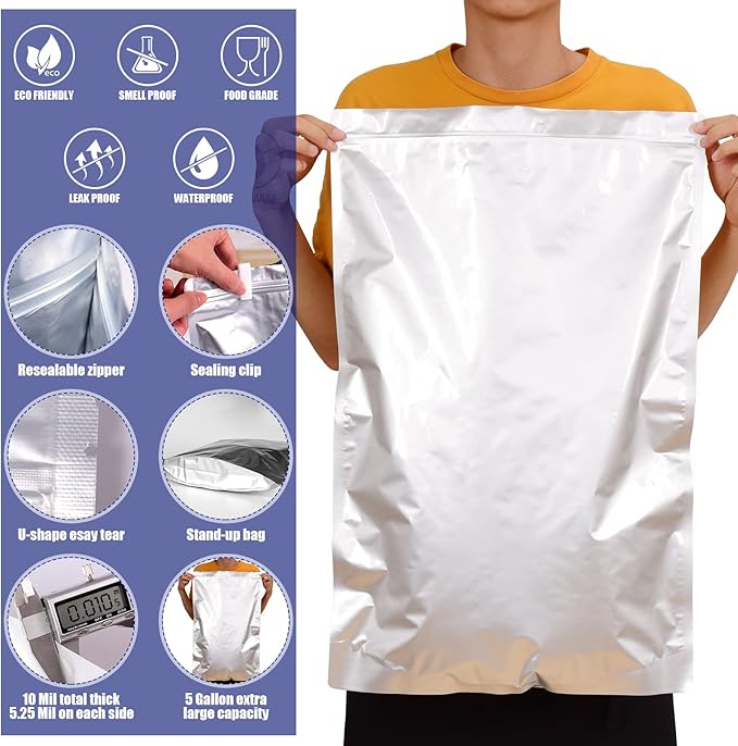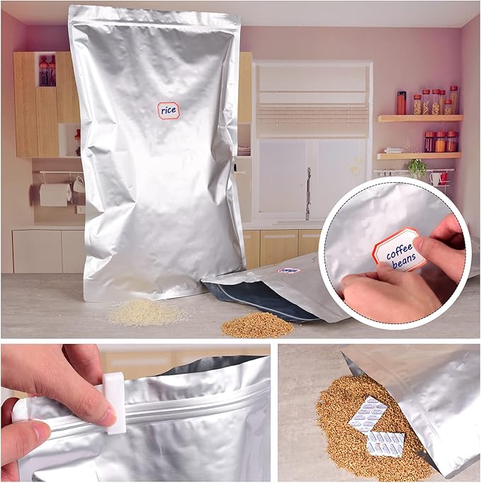 - [LARGE CAPACITY & WIDE USAGE] Extra large capacity 5 gallon bags help you store more of what you want, plus 2000cc oxygen absorbers, it will be the perfect solution for long term food storage. Perfect for grains, rice, oats, coffee beans, beans, freeze-dried products, nuts, tea, dog treat etc kitchen food storage