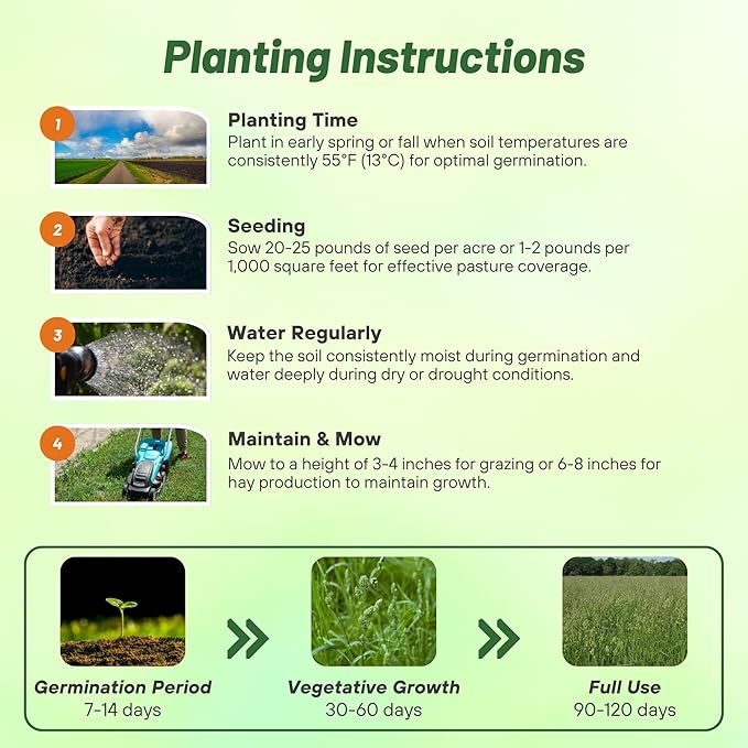- OPTIMAL PLANTING & SOIL COMPATIBILITY: Our orchard grass germinates in just 6–10 days under warm, moist conditions. For optimal results, plant at 20–25 lbs per acre in spring or fall and provide medium to high nitrogen inputs to encourage robust growth. Perfect for pasture chicken systems or enhancing grass seeds for lawn projects.