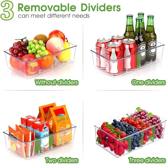 - 【Customizable 4-Compartment Organizer】Storage bins featuring with 3 removable dividers – Adjust compartments to fit chips, spices, condiment packets, fruits, or other small items. Perfect for kitchens, RVs, or pantries that need flexible storage.