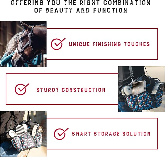 - Includes a comb, hoof pick, palm held curry comb, palm held face brush, mane and tail brush, dandy brush and sweat scraper/coarse curry combo
