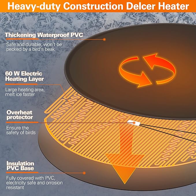 - Efficient Ice Melting: the bird bath deicer is designed as a 9.45 inches diameter disc; The bird heater has a large heating area and high deicing efficiency