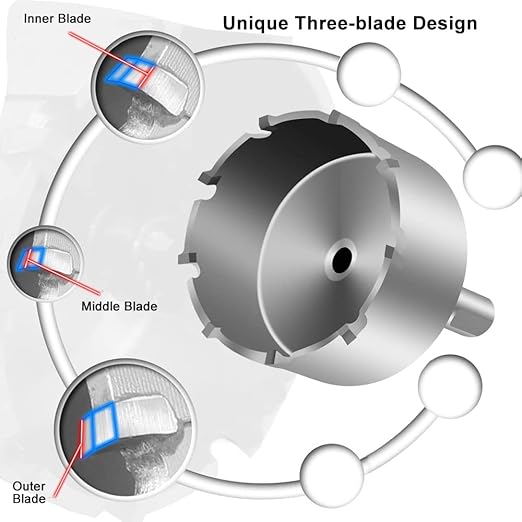 - 【Unique Three-blade Design】 This TCT hole Saw teeth designed with Three-blade, Include outer blade, middle blade, and inner blade, making it sharper and more efficient, ideal for cutting metals;