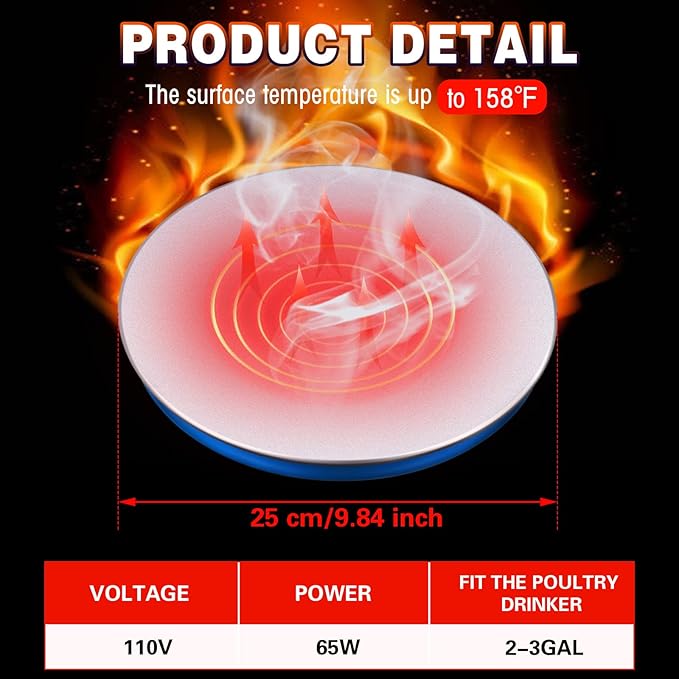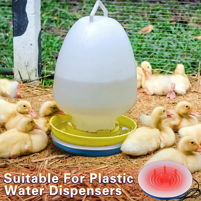 - Safe for Poultry and Energy Saving: the chicken heated base with 59 inch safe standard power cord, chickens won't get hurt if they are pecked at the electric cord; Not only prevent poultry from being scalded by high temperature but also bucket water dispenser from freezing, saves electricity