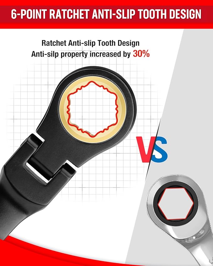 - Ratchet anti-slip tooth design keeps wrench head tight, with no slipping and flopping around, increasing anti-slip property by 30%. The ratcheting wrench grips fasteners, even when they become rounded due to long-term wear