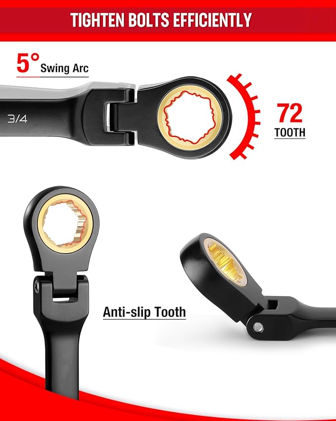 - The 72-teeth ratchet gear inside the box ends is smooth and requires only five-degree swing arc, allowing it to turn in limited spaces and enabling easy and fast operation. The 180-degree flex head helps you reach small places for effortless operation
