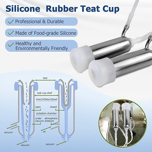 - 【More comfortable milking experience】While milking, our adjustable milker will imitate the feeling of cow when sucking milk, prevent teat bleeding or bruising, giving your cow a more comfortable milking experience. Also, you can adjust the suction power of the pulse system with the knob to reduce the discomfort of cow during intense milking