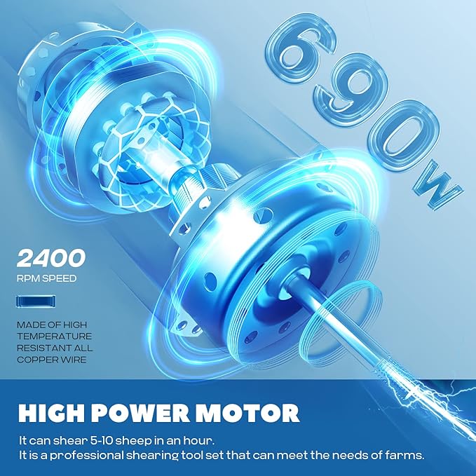 - 690W HIGH POWER - 690W high power motor made of high temperature resistant all copper wire set with 2400RPM speed, featuring ultra-low power consumption, ultra-high temperature resistance, powerful output and long machine life. It is a professional shearing tool set that can meet the needs of farms. It can shear 5-10 sheep in an hour, and can restore long wool for goats, sheep, alpacas, llamas, alpacas, large dogs, Angora rabbits and other animals to restore long wool.