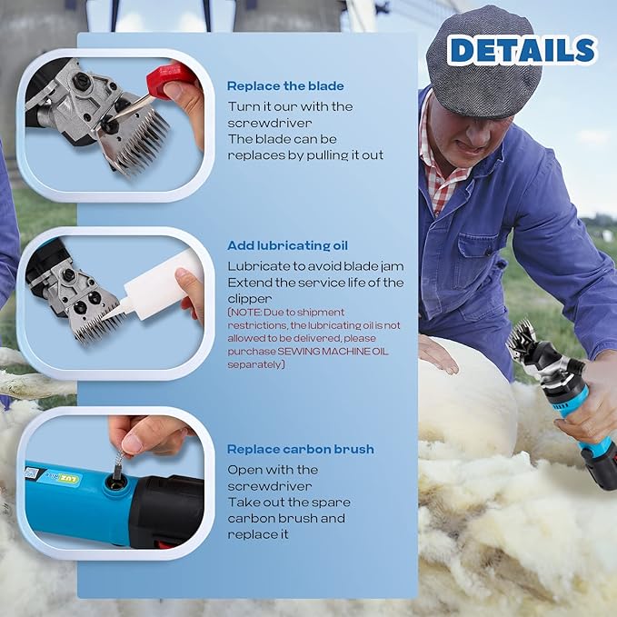 - PACKING LIST - 1 x Electric sheep clipper with 13-teeth straight blade set; 2 x Lithium batteries; 1 x Charging base; 1 x Cleaning brush; 1 x Oil bottle (WITHOUT oil); 1 x Blade tool driver; 1 x Durable carriage case; 1 x Operating manual. PLEASE NOTE: Due to shipment restrictions, the lubricating oil is not allowed to be delivered, please purchase SEWING MACHINE OIL separately, which can prolong the service life of the clipper effectively.