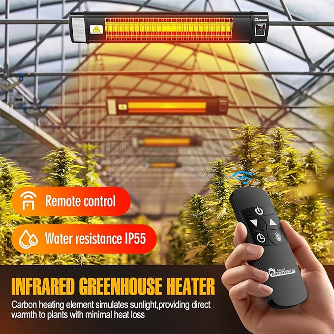 - WATER RESISTANCE IPX5 - Indoor and outdoor rated heater, IP55. Instantly warm up the area with clean and odorless infrared heat, ideal for greenhouse heating, shed, store room, garage, milk house, grow tent.