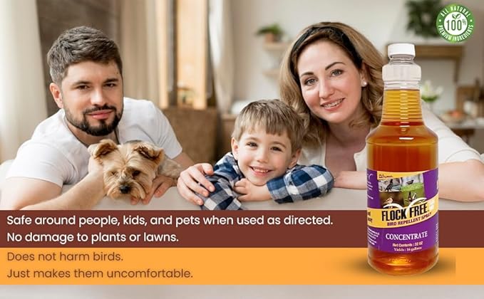 - SAFE: All-natural formula! Safe to use around people, pets and livestock when used as directed. Does not hurt birds, just makes them uncomfortable so they leave the area. Does not harm trees, plants or lawns.