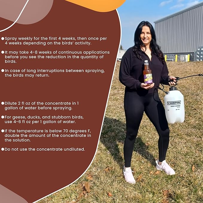 - ECONOMICAL: Simply dilute with water and makes up to 16 gallons of ready to use product! See the easy to follow instructional video on how to prepare the bird repellant spray. Spray to keep birds from nesting.